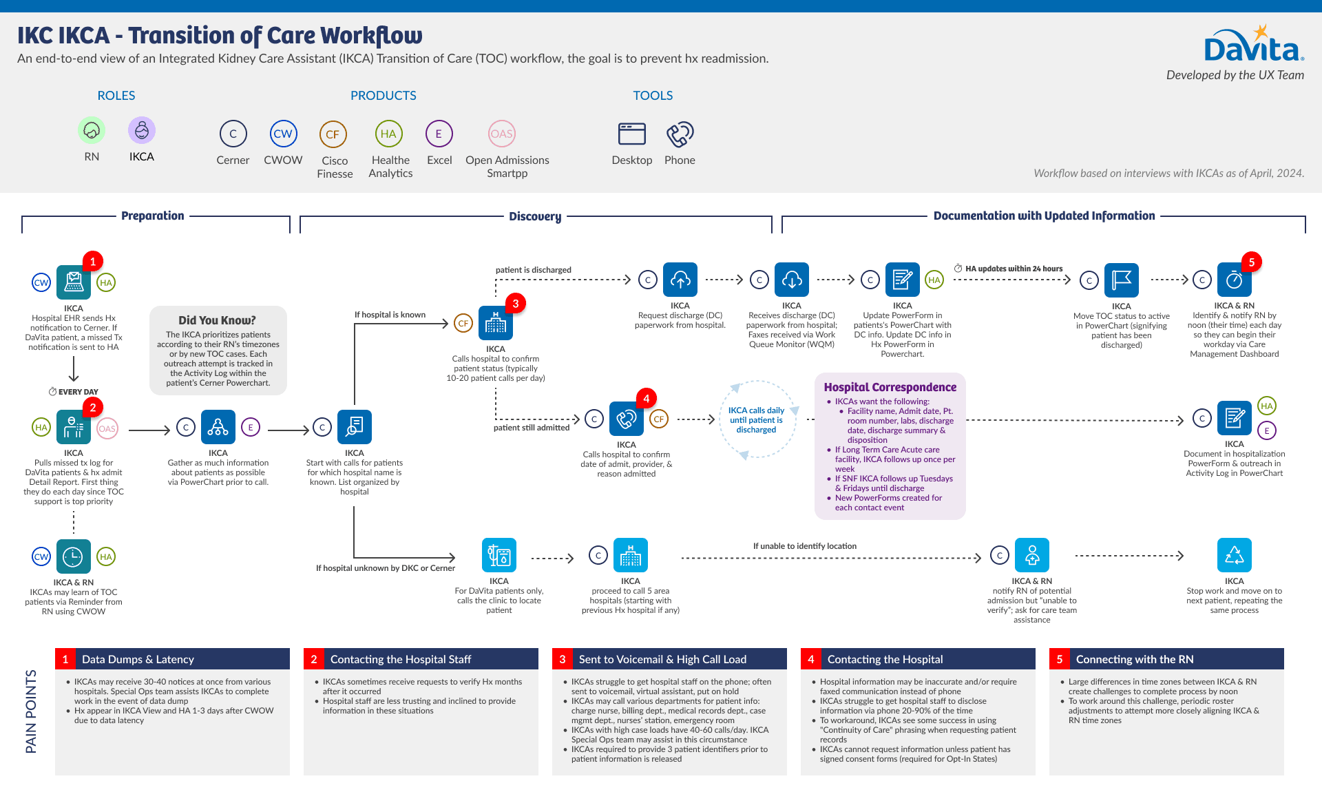 The Open Admissions Smartapp (OAS) was initially intended to feed data into clinical workflows, leaving the user interface disconnected from real-world workflows. The tool forced Integrated Kidney Care Assistants (IKCAs), who support Registered Nurses (RNs) in patient outreach, into inefficient workflows.